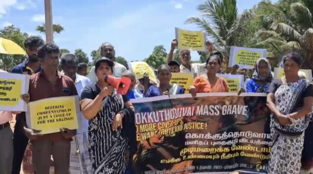 கொக்குத்தொடுவாய் மனிதப் புதைகுழி விடயத்தை மூடிமறைக்க வேண்டாம் எமக்கு உண்மையும் நீதியும் வேண்டுமென கோரியும் கொக்குத்தொடுவாய் உள்ளிட்ட மனிதப் புதைகுழிகளுக்கு நீதி விசாரணை கோரியும் காணாமல் போனோர் அலுவலகம் ( OMP) வலிந்து காணாமல் ஆக்கப்பட்டவர்களின் உறவுகள் மீதான மேற்கொள்ளும் அச்சுறுத்தல் அழுத்தம் வழங்கும் செயற்ப்பாடுகளை கண்டித்தும் கவனயீர்ப்பு போராட்டம் ஒன்று இன்று20) கொக்குத்தொடுவாய் மனித புதைகுழிக்கு அருகில் இடம்பெற்றது .