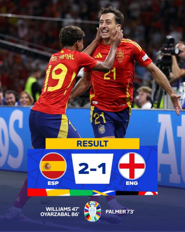 ஜரோப்பியக் கிண்ணத் தொடரின் இறுதிப் போட்டியில் சற்று முன்னர் இங்கிலாந்தை 2-1 என்ற கோல்க்கணக்கில் வெற்றி கொண்ட ஸ்பெயின் 4 ஆவது முறையாக சம்பியன் பட்டத்தை தனதாக்கிக்கொண்டது.